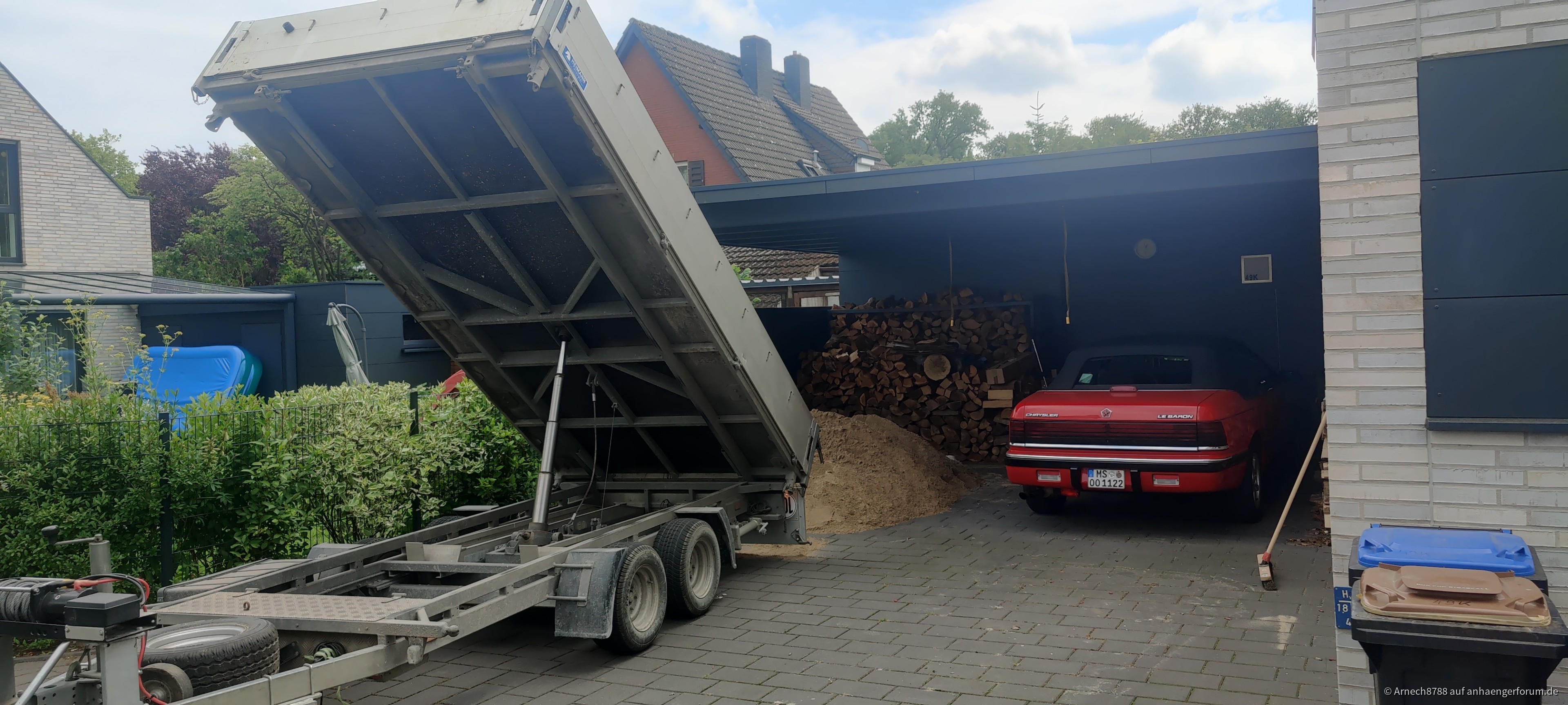 Abkippen von ca. 2 Tonnen Sand mit einem 4m langen 3-Seitenkipper