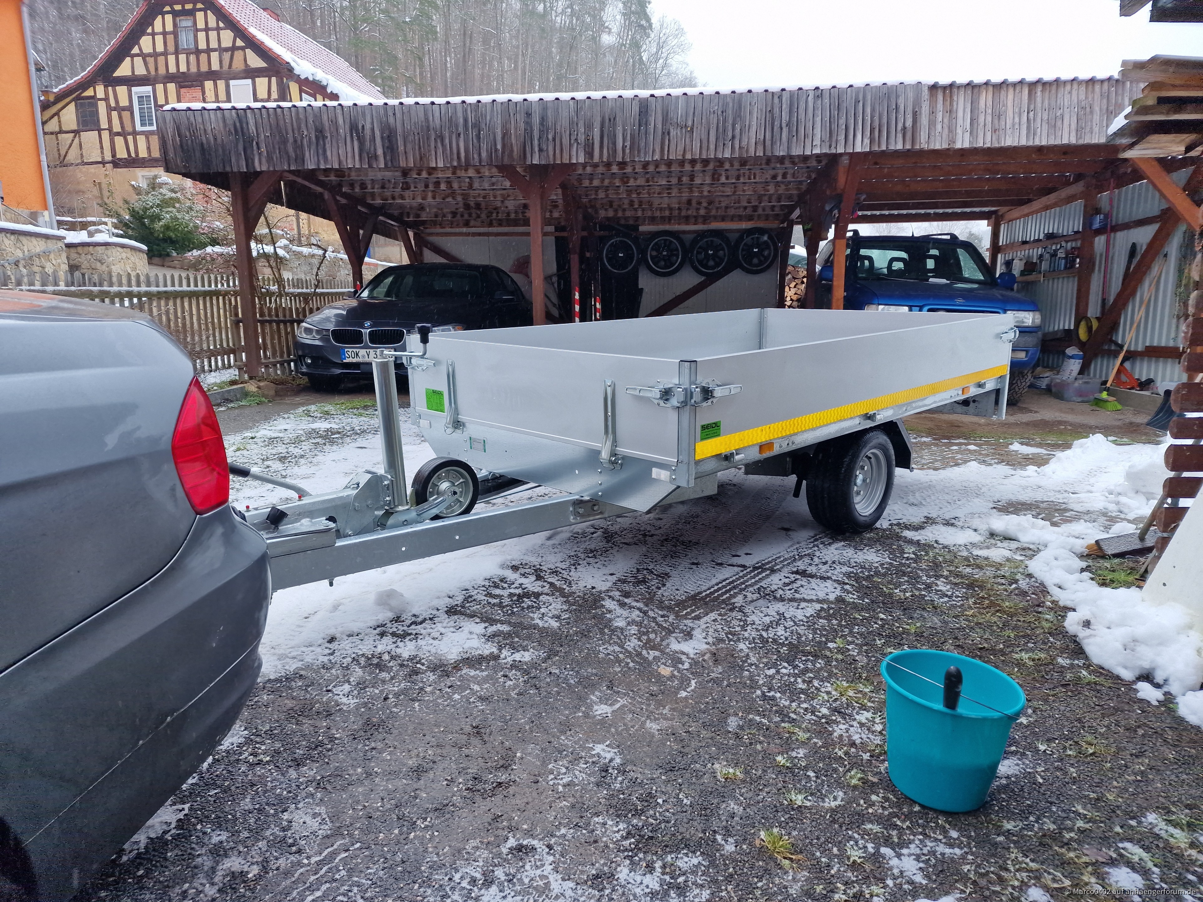 Ich hatte vorher 14 Jahre einen 750kg Saris Anhänger, der mir zu klein geworden war und nicht gebremst war. Deshalb habe ich mir diesen 1350 kg Eduard Anhänger gekauft, ich mach auch viel Brennholz und muss da auch ziemlich steile Berge herunterfahren, da ist ein gebremster Anhänger schon besser. Ich habe ihn so 200km weit (Weiden) geholt und die Straßen waren Winderlich heißt gesalzen, da müsste der Anhänger gleich gewaschen werden (siehe Bild Eimer) .
