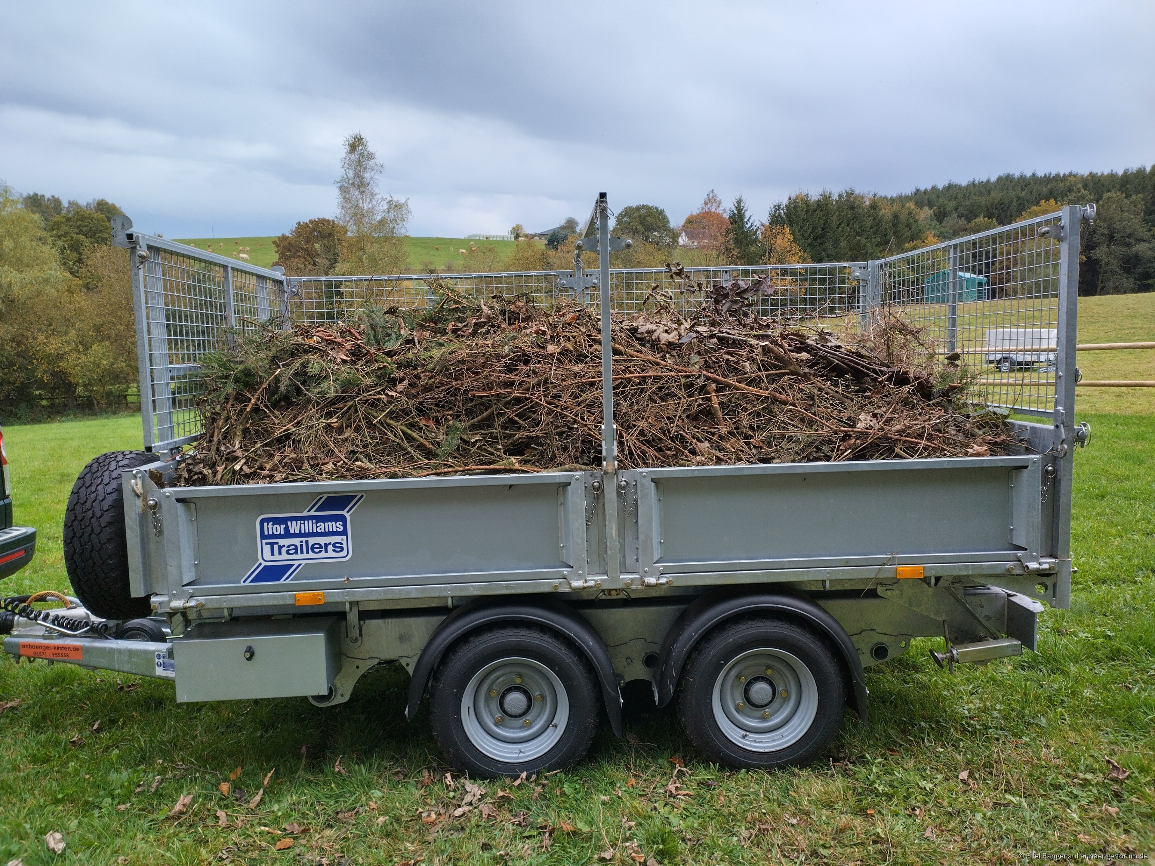 Der Anhänger ist ein gebremster Ifor Williams TT3017 Kipper mit Bordwanderhöhung durch klappbare Laubgitter und einem zulässigen Gesamtgewicht von 3500kg, das Leergewicht beträgt 880kg.