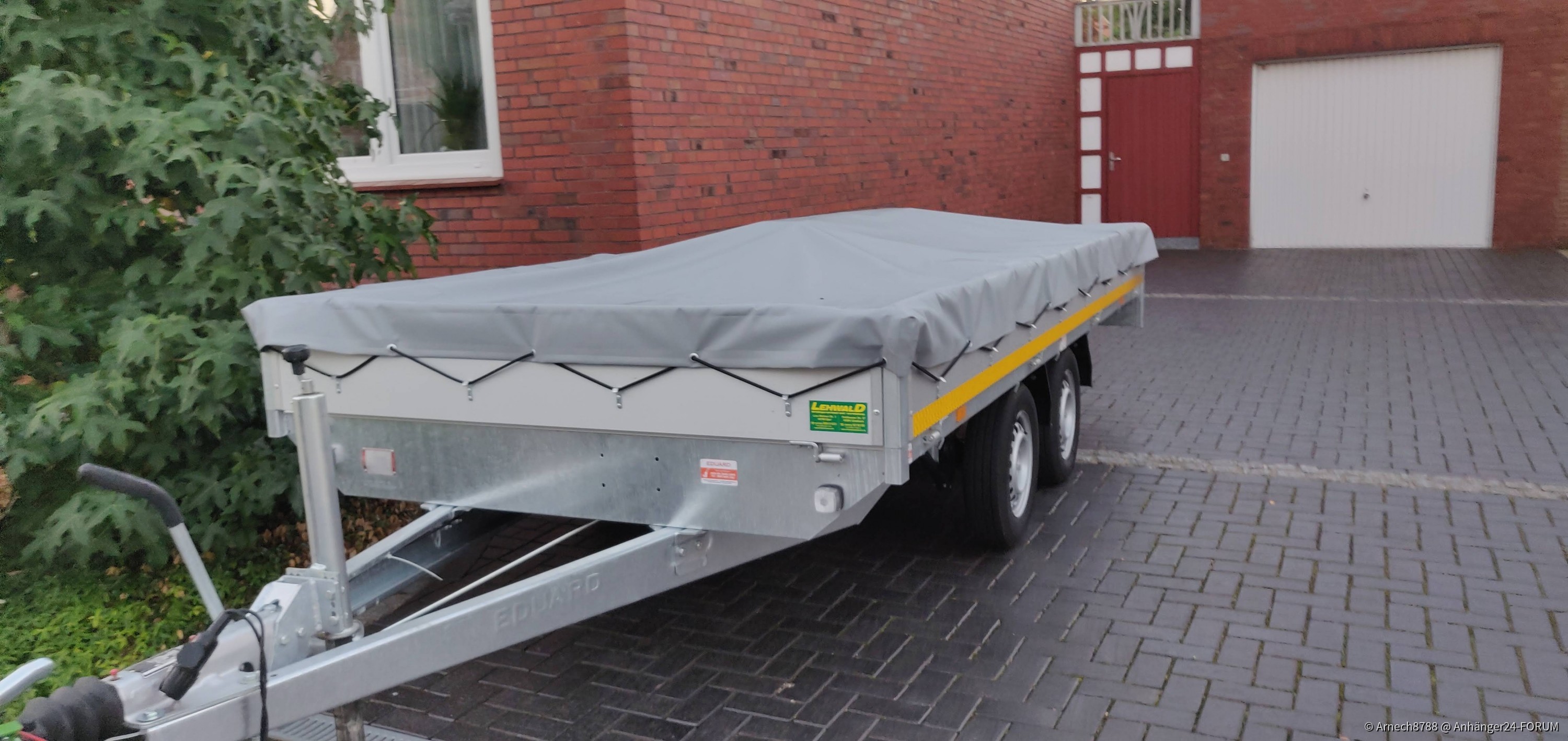 Leider war ich bei der Angabe der Maße für die Flachplane etwas großzügig. Hier habe ich eine kleine Palette in die Mitte des Anhängers gestellt, sodass das Wasser nicht auf der Plane stehen bleibt.